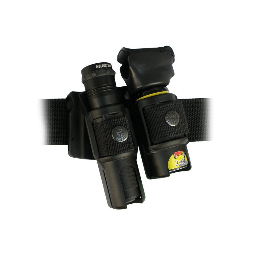 Dvojité plastové otočné pouzdro je sestaveno z pouzdra LH-04 (pro svítilnu) a z pouzdra SH-04 (pro sprej) spojených speciálním adaptérem. Výhodou tohoto řešení je úspora místa na opasku.