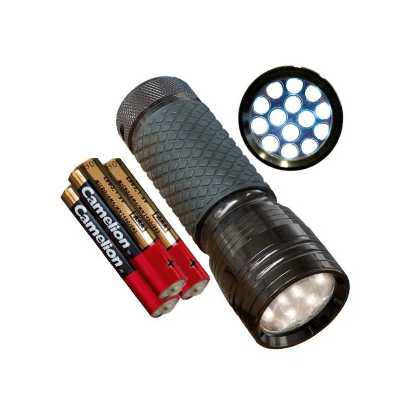 Odolná duralová vlhkuvzdorná svítilna se 14 ks LED diod. Nerozbitné přední polykarbonátové sklíčko. Svítí velmi intenzivním světlem s širokým paprskem. Rozsvěcuje se spínačem na koncovce. Pogumovaná rukojeť. Barevné provedení černá nebo leskle šedočerná. Napájení pomocí 3 ks alkalických článků typu 3AAA, které jsou v ceně svítilny a nebo nabíjecími akumulátory.