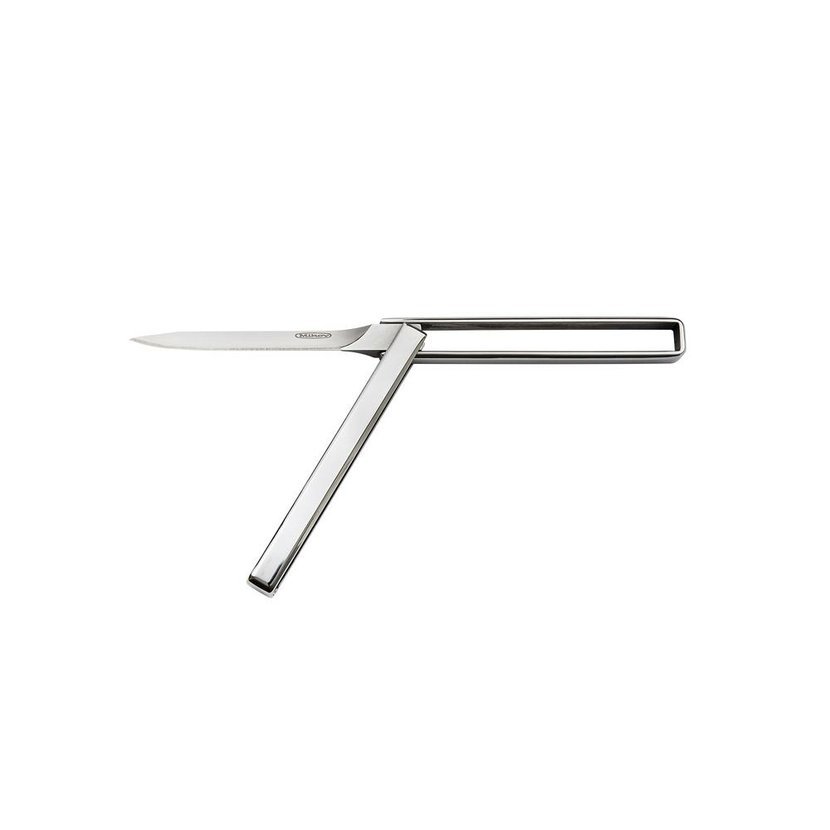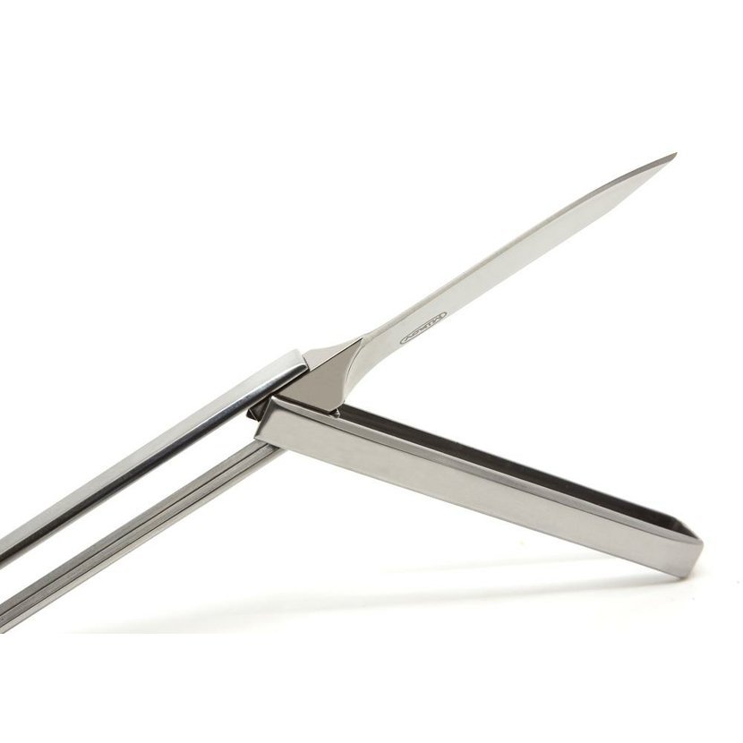 Unikátní řešení konstrukce nože působí na první pohled jako zajímavý hlavolam. Dvojitým překlopením nerezových střenek o 180 stupňů se nůž uvede do pohotovostního stavu. obráceným způsobem středošpičatou čepel skryjeme. Držadlo nože je na všech hranách sraženo pro lepší ergonomii a pohodlné uchopení nože.