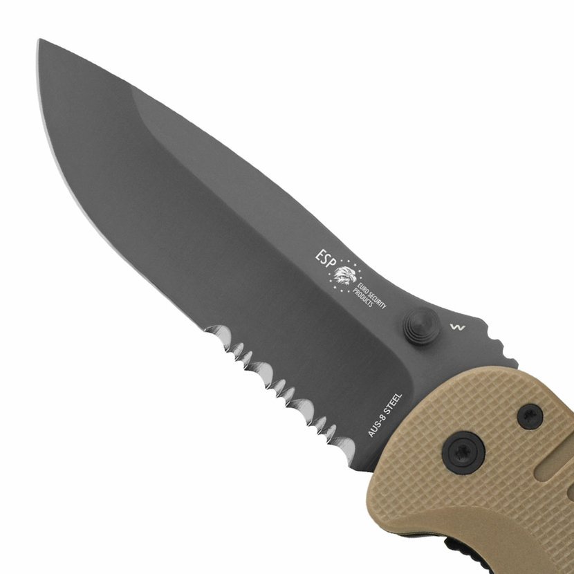 ergonomický tvar rukojeti dobře padnoucí do levé i pravé ruky ● kovový klip částečně zapuštěný ve střence, ze které nevyčnívá ● rukojeť vyrobena z odolného polyamidu PA66 ● praktické očko pro zavěšení ● střenka v barvě khaki